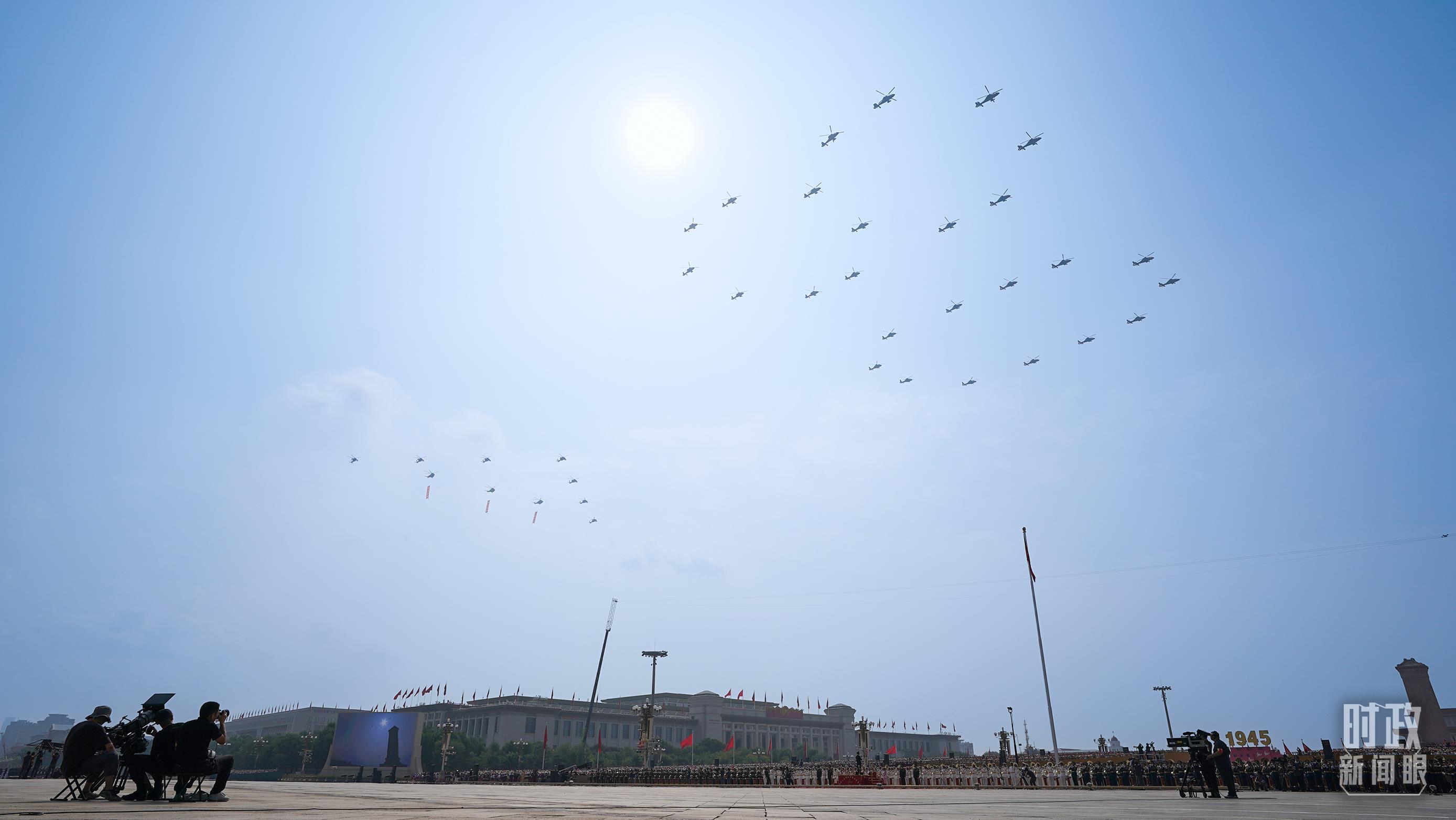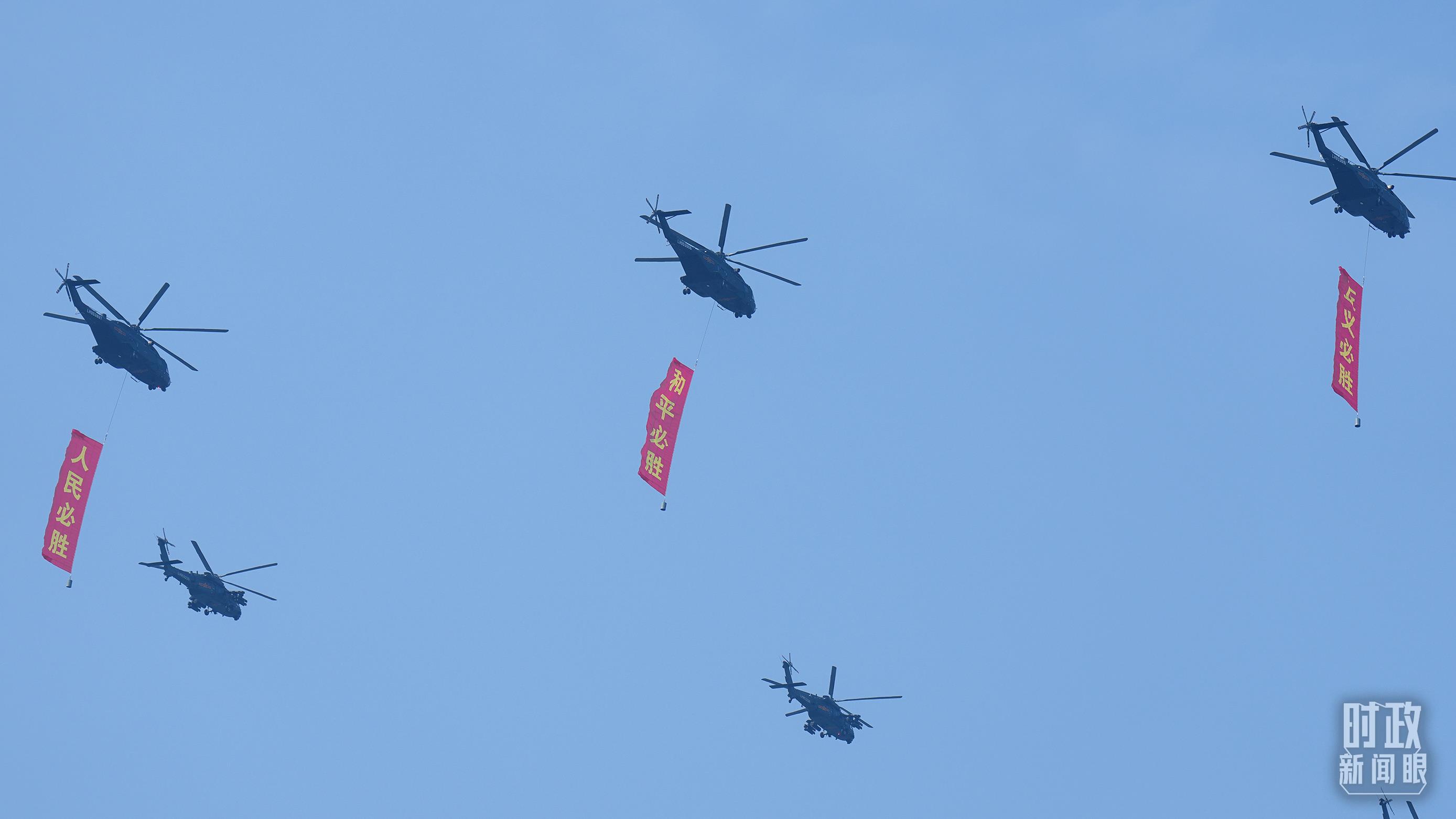 △9月3日,3架直升机分别悬挂“正义必胜”“和平必胜”“人民必胜”条幅飞过广场。(总台记者李晋拍摄)