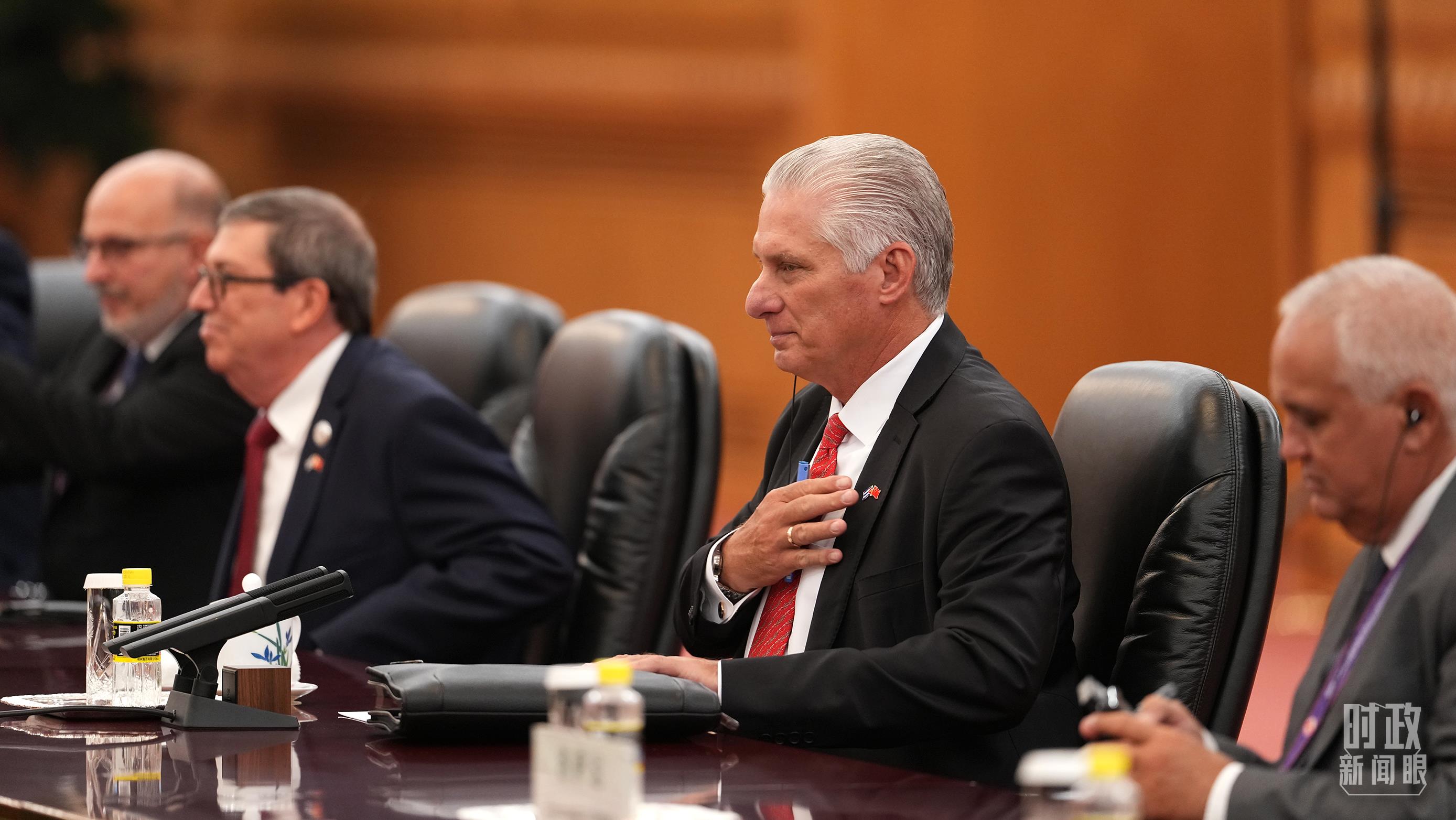△古巴中央委员会、古巴国家主席迪亚斯-卡内尔在会见中。(总台记者李晋拍摄)