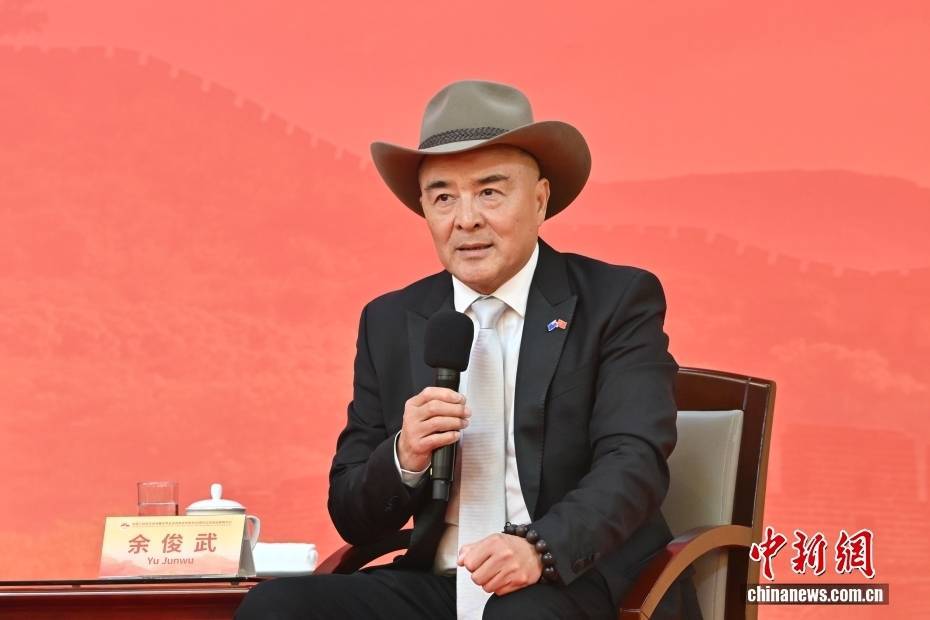9月1日下午,中国人民抗日战争暨世界反法西斯战争胜利80周年纪念活动新闻中心举办第二场记者见面会,缅甸中华总商会会长林文猛、马来西亚吉隆坡广东义山主席杨博耀、斐济华人文化艺术经济联合会荣誉会长方志伟、西班牙中国和平统一促进会会长徐松华、澳大利亚悉尼华星艺术团团长余俊武等华侨华人代表介绍华侨华人在世界各地举行的纪念活动及其对抗战的贡献等方面情况,并回答记者提问。图为澳大利亚悉尼华星艺术团团长余俊武在见面会上发言。中新社记者 赵文宇 摄